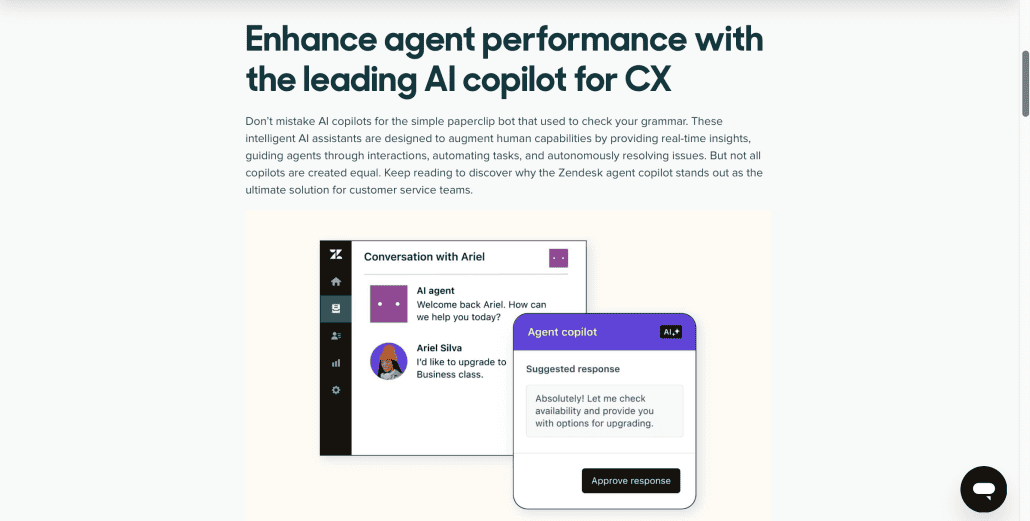 It seems that there is no established form on the market when it comes to the format of these helpers. Some companies create “copilots”, or chat interfaces, that “live” in the agent portals and through which agents can get help in everyday jobs. See this example by Zendesk.