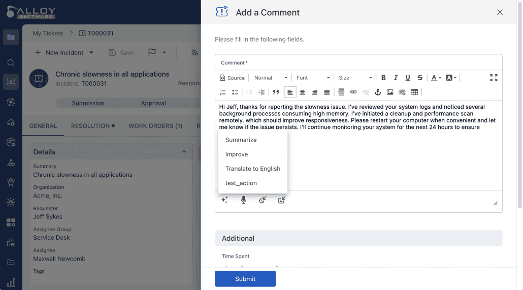 These smart workflow steps aren’t limited to tickets—they can be applied to any process or object in Alloy Navigator. Whether it’s approving changes, analyzing requests, or summarizing updates, AI can support the flow behind the scenes while keeping you in control of the outcome.