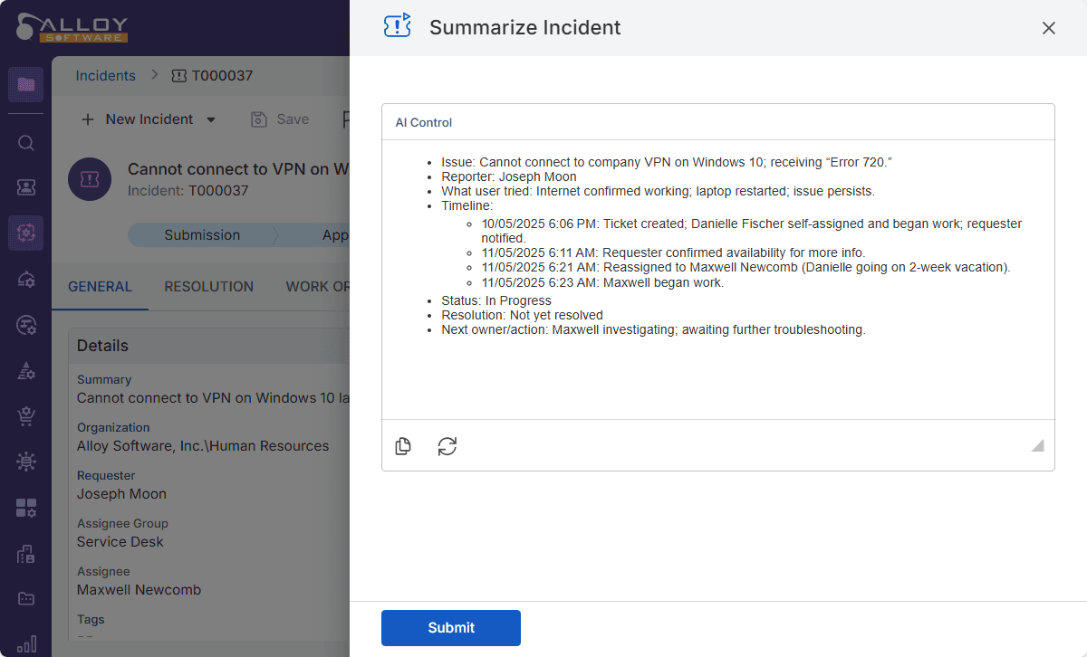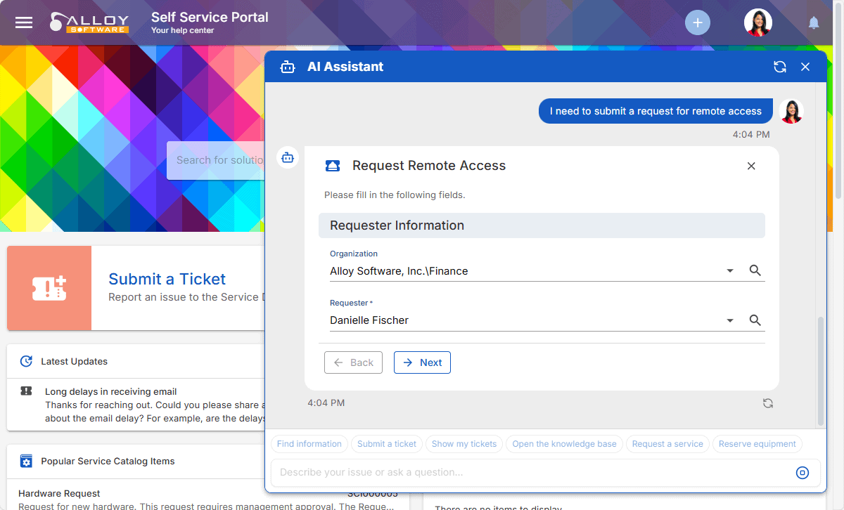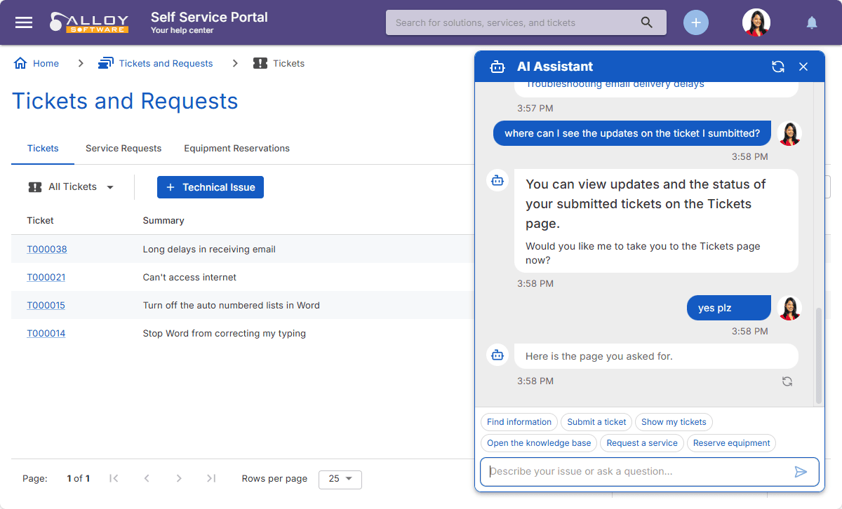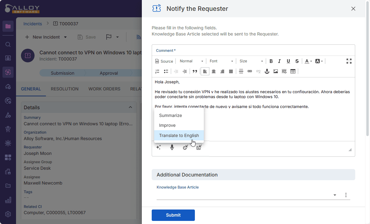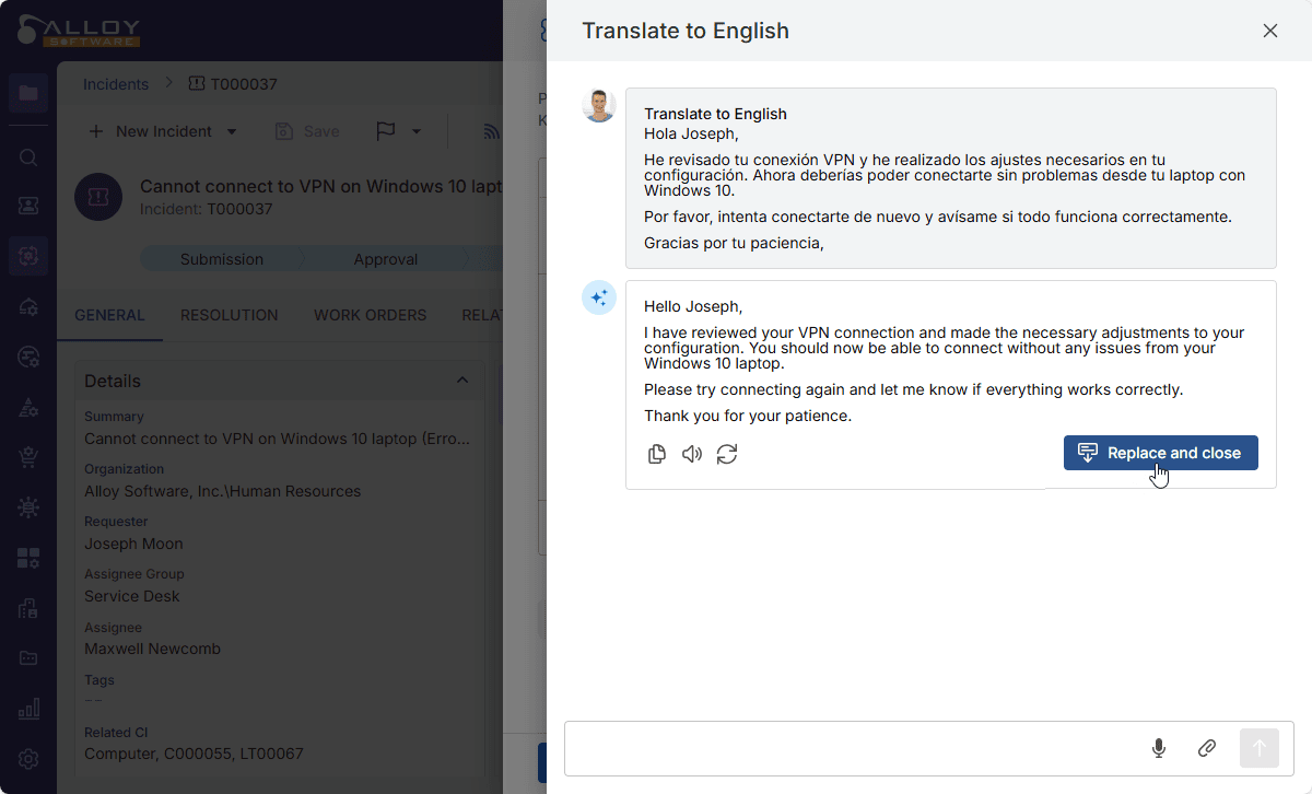 Seamless multi-language support: AI provides automatic translation for communications across different languages, based on the requester’s organization or location. Agents can work in one language while requesters interact in another, ensuring everyone clearly understands the conversation.