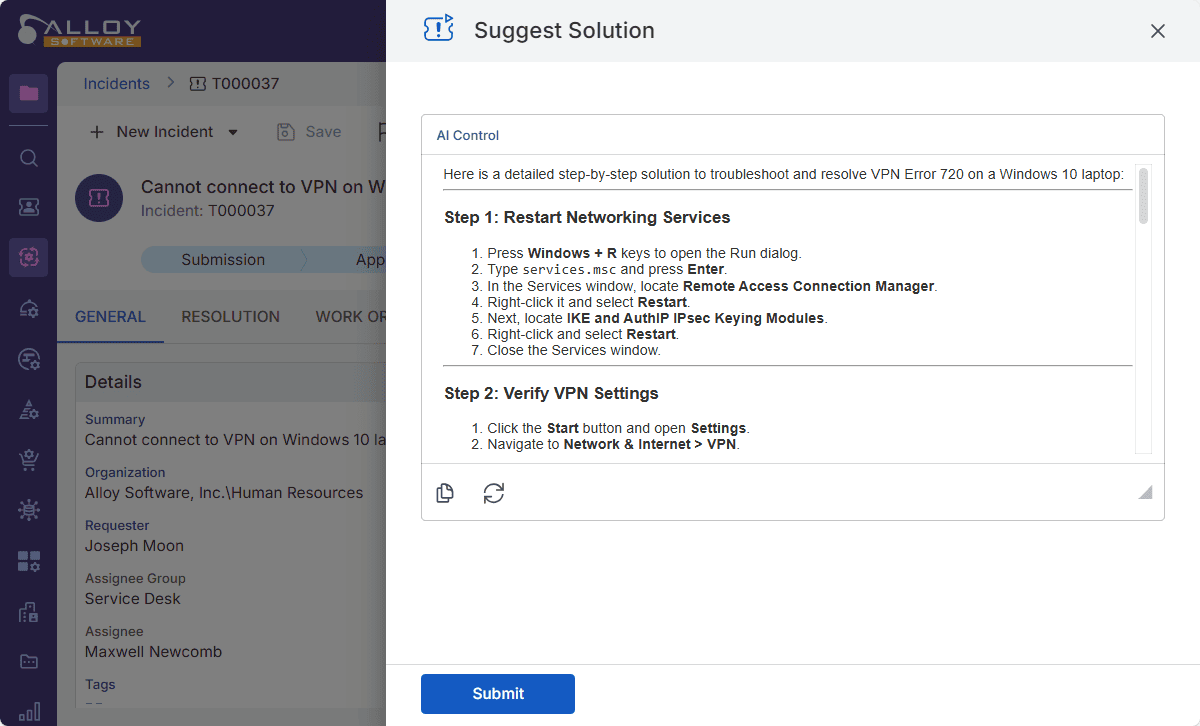 Ticket assignment: AI automatically assigns tickets to the most appropriate technicians, taking into account classification, priority, current workload, and availability. For example, a high-priority network issue might be routed to a senior technician who is free, while routine requests go to the general queue. This ensures tickets are handled efficiently and by the right person every time.