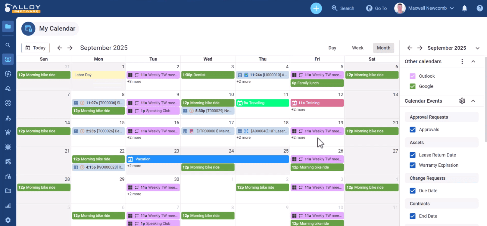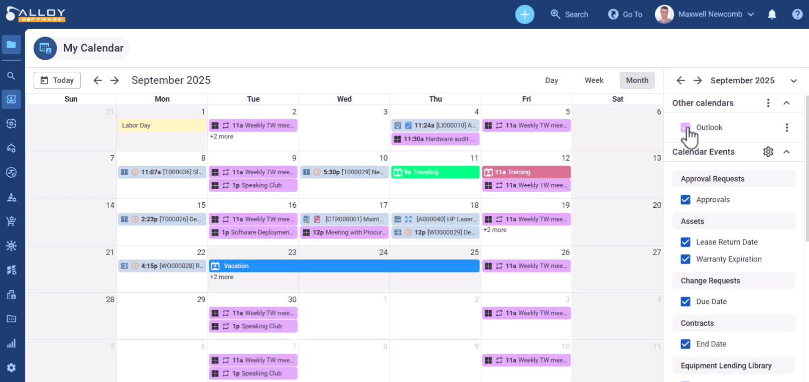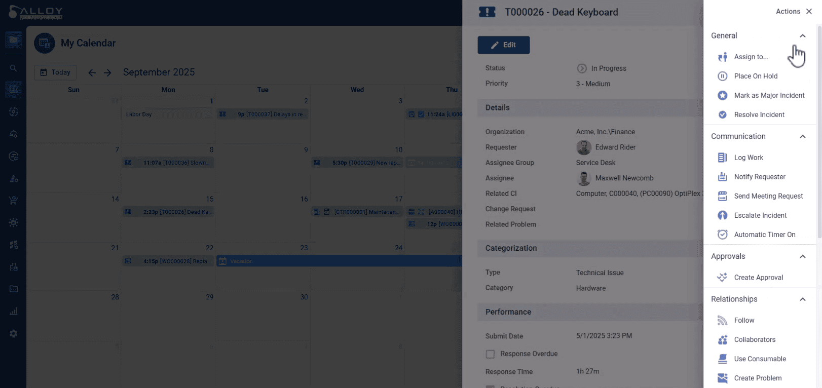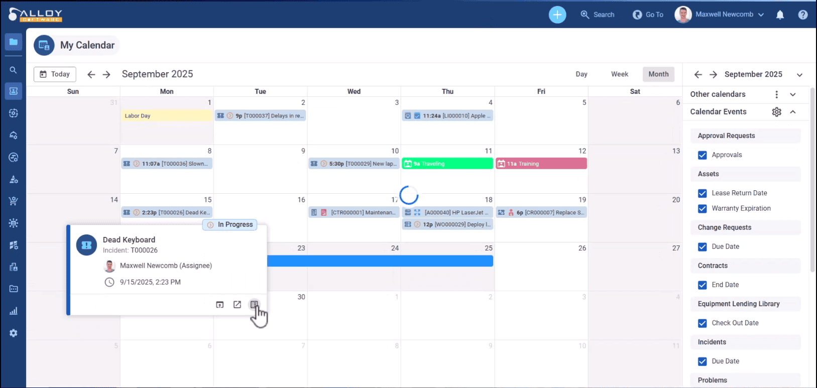 My Calendar is your personalized, all-in-one scheduling tool built right into Alloy Navigator. Designed to gather everything you’re responsible for — support tickets, changes, meetings, and even personal events — it gives you a complete picture of your work and availability. No more jumping between apps or missing what matters.