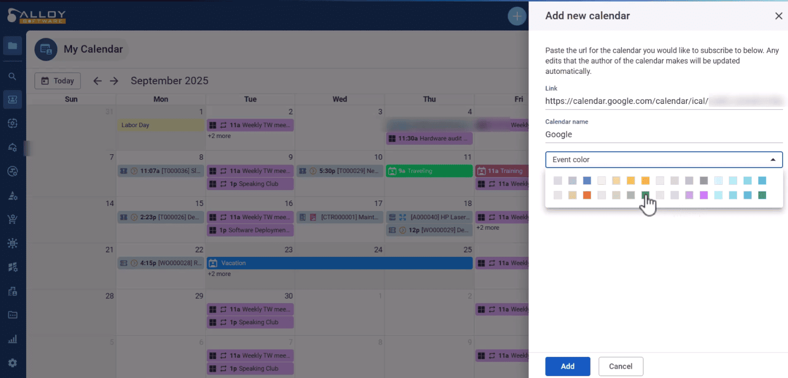 Color does more than look nice — it helps you process information faster. In My Calendar, Alloy Navigator items use familiar system colors, while external calendar events are clearly marked with a different hue.