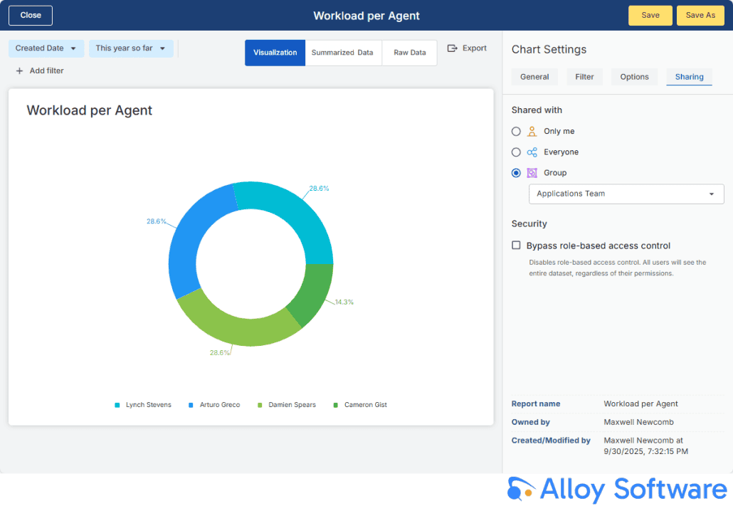 Over 40 ready-to-use charts allow teams to track key metrics like Resolution Time, Customer Satisfaction, and others. Users can quickly create custom charts with a simple interface, apply filters, and share or export results.