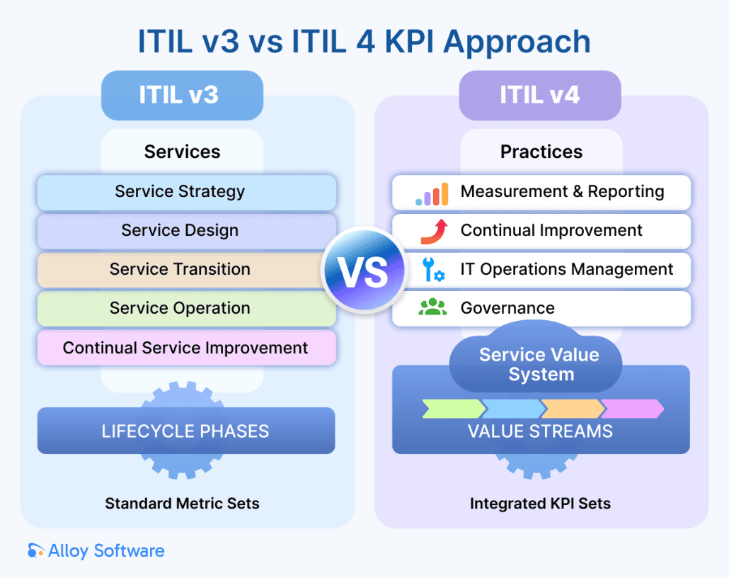 The introduction of ITIL 4 significantly changed how organizations approach management KPIs measurement. Unlike ITIL v3, which often aligned standard metric sets with a structured service lifecycle, ITIL 4 integrates KPIs into the Measurement & Reporting practice within the broader Service Value System (SVS).