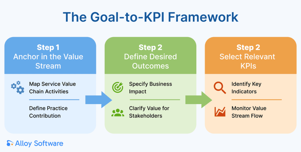 The fix: Start by clarifying the intended outcome and value for stakeholders, then select KPIs that show whether the service and its value streams are actually contributing to that outcome.