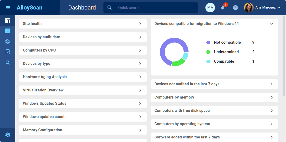 AlloyScan, a lightweight cloud-based inventory solution, displays a ready-made widget with an interactive chart of all Windows 10 PCs, clearly showing which devices are ready for migration and which are not. This makes it easy to prioritize upgrades, schedule hardware replacements, or plan phased rollouts, all while keeping IT operations under control.