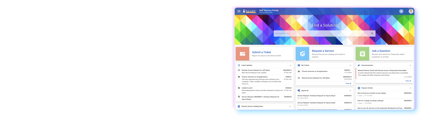 Alloy Self-Service Portal helps your employees and customers easily request services and quickly get the answers they need, anytime and anywhere.